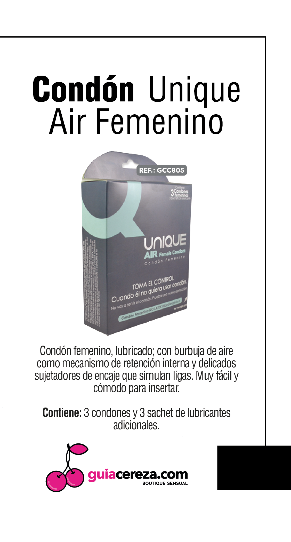 Condón femenino, lubricado; con burbuja de aire como mecanismo de retención interna y delicados sujetadores de encaje que simulan ligas. Muy fácil y cómodo para insertar.